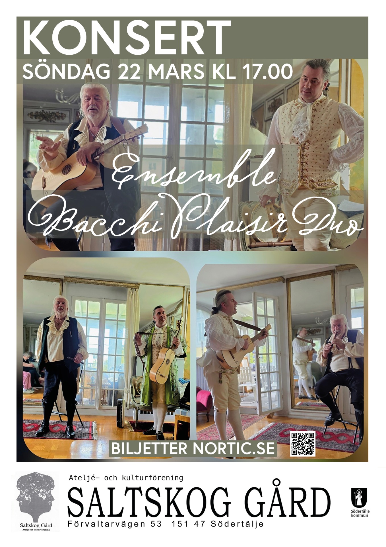 Ensemble Bacchi Plaisir Duo bjuder på en galant och glättig musikresa med musik från ca 1650–1790 på tidstypiska instrument och handsydda dräkter. Dansmusik, dryckesvisor, arior och lustiga sånger från Sverige, Frankrike, Italien och England står på programmet. En stor del av repertoaren utgörs av sånger och epistlar av Carl Michael Bellman.